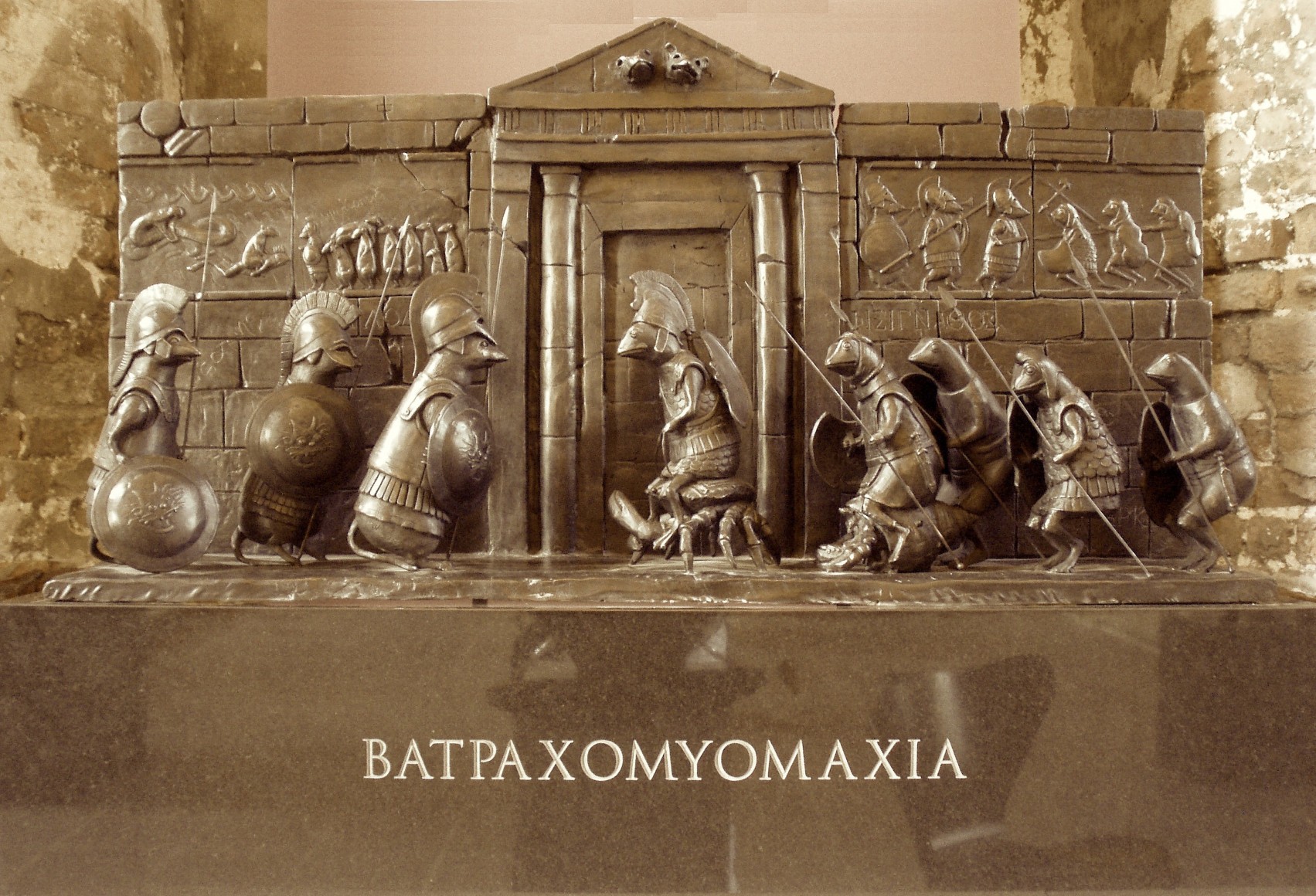 The Batrachomyomachia, or the Battle of the Frogs and the Mice, is an ancient Greek parody, based on Homer's epic poems, the Iliad and the Odyssey. A mouse, known as Crumb-snatcher, meets Puff-jaw, the frog king, on the bank of a lake. Puff-jaw invites Crumb-snatcher to visit his court on the opposite bank, and offers the mouse a ride on his back. The waves grow more turbulent, and soon a serpent attacks the mouse and frog. Puff-jaw dives to safety, but Crumb-snatcher drowns. News of Crumb-snatcher's death reaches the other mice, and (after a funeral oration by his father, Bread-nibbler) they prepare for war.