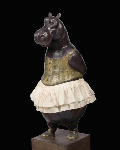 In Okholm Skaarup’s intricately polychrome work, he explores the voluminous form of a tutu and leotard-clad hippo, which at once references Degas’s Little Dancer of Fourteen Years and Walt Disney’s Fantasia. Or another hippo, sprawled in the pose of Ingres’s Grande Odalisque, or even a Dinosaur paleontologist, mystified to discover the Flintstones’ Flintmobile among the rubble.