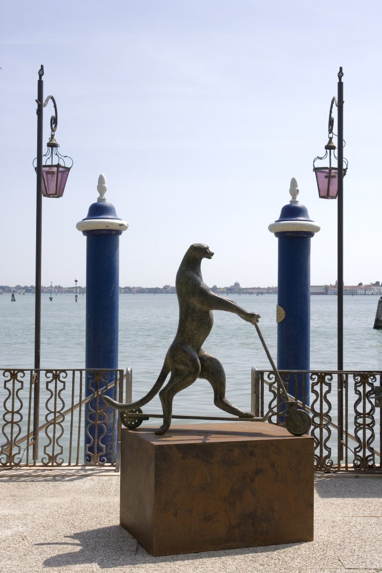 Okholm Skaarup has created a contemporary bestiary, or classical book of animals, in bronze. Each sculpture presents a whimsical story or allegory to decipher, with sources ranging from ancient fables and art history to music and modern animation. The Majestic Lion, traditional king of the animals, wears the crown and armor of a great monarch in the style of Medici court sculptor Giambologna, yet he sits astride a rocking horse, a reference to his fleeting and jovial power. Frogs reenact Homeric battles in the Batrachomyomachia, while mice peer through spectacles and listen at telephones as The Five Senses. A cheetah rides a scooter to move faster, a giraffe stands on stilts to reach higher, and a kangaroo bounces on a pogo stick—a “kængurustylte” in Okholm Skaarup’s native Danish.