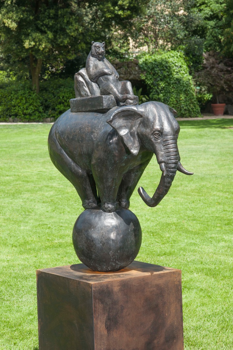 Elephants are known for their memory, and for their gentle nature. But if provoked, they can attack. As working animals and circus attractions, hunters and performers rode on their backs, perhaps chasing another animal—a tiger, for instance. Now the tables have turned: the tiger is sitting on top of the elephant, contentedly rubbing his belly, as a telling pith helmet rests at his feet.