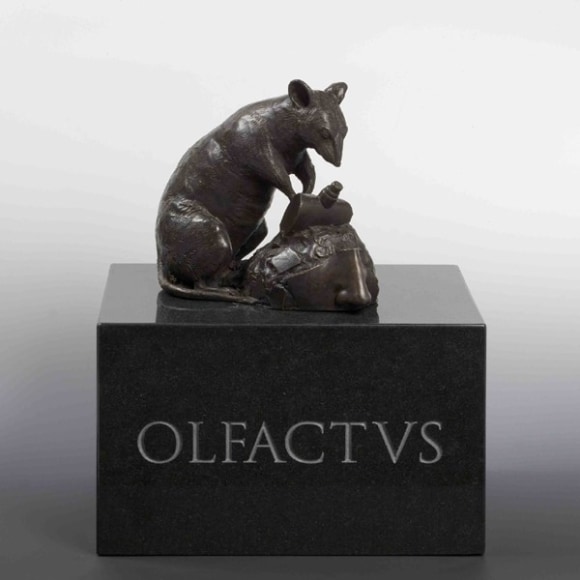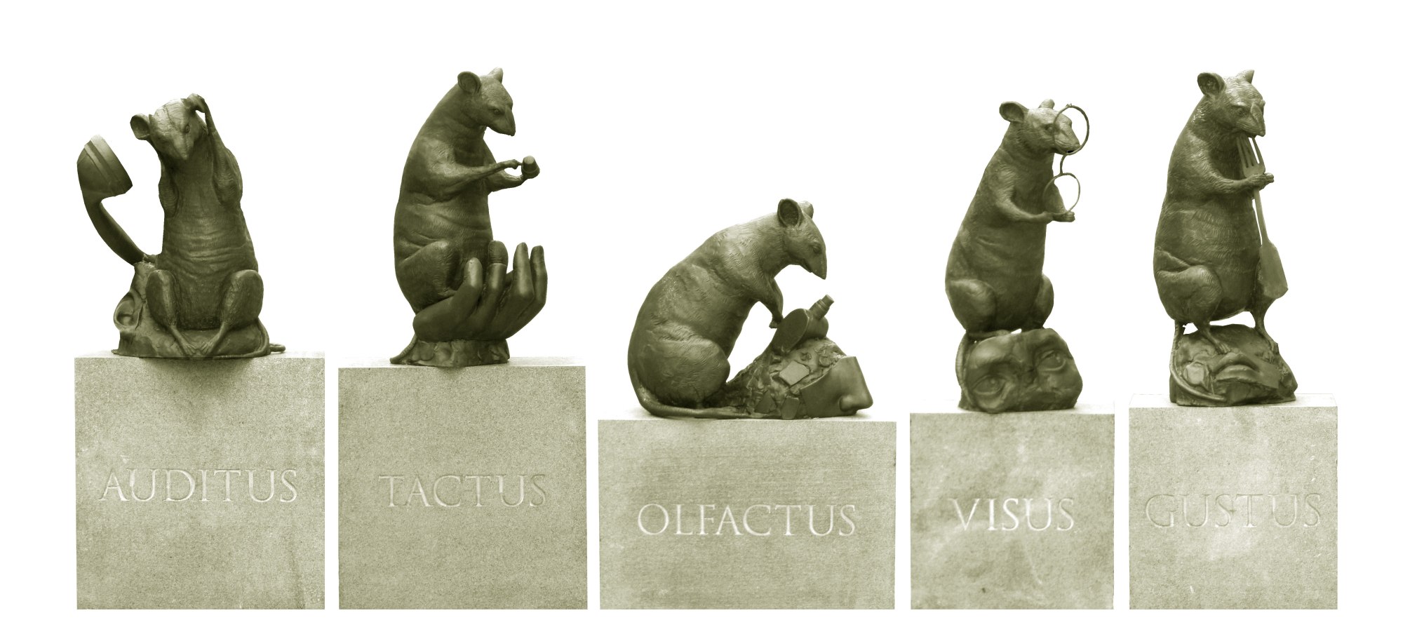 The five senses are represented by a group of mice. In a post-human world, the mice discover fragments of Donatello's Saint George sculpture, as well as human objects alluding to the senses: a thimble, spectacles, a telephone, an empty perfume bottle, and a fork.
