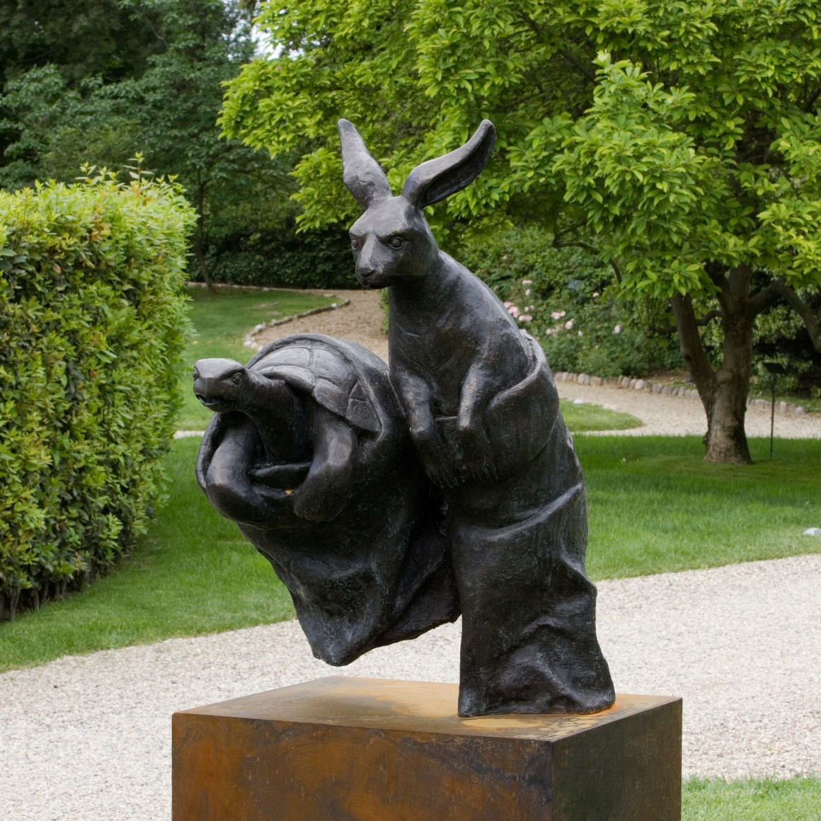 In Aesop's The Tortoise and the Hare, the hare challenges his slow friend to a race. Sure of his victory, the hare stops for a nap, only to wake in time to see the turtle shuffling to victory. Here the competition is a sack race, as the two animals test their perseverence--yet, in the end, the turtle still finishes a hare ahead.