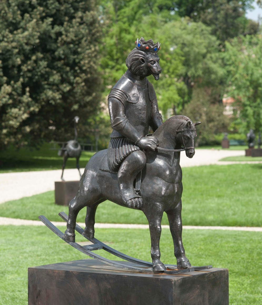 The lion is king of the animals. In antiquity, the lion's prominence was likened to the sun among the heavenly spheres, the heart in the human body, and gold among the precious metals. Here the lion is depicted as a Renaissance monarch, in a pose and armor inspired by Medici court sculptor Giambologna. Wearing a crown encrusted with jasper and lapis lazuli, the lion sits astride his mount—his pomp tempered only by the jaunty rails of a rocking horse.